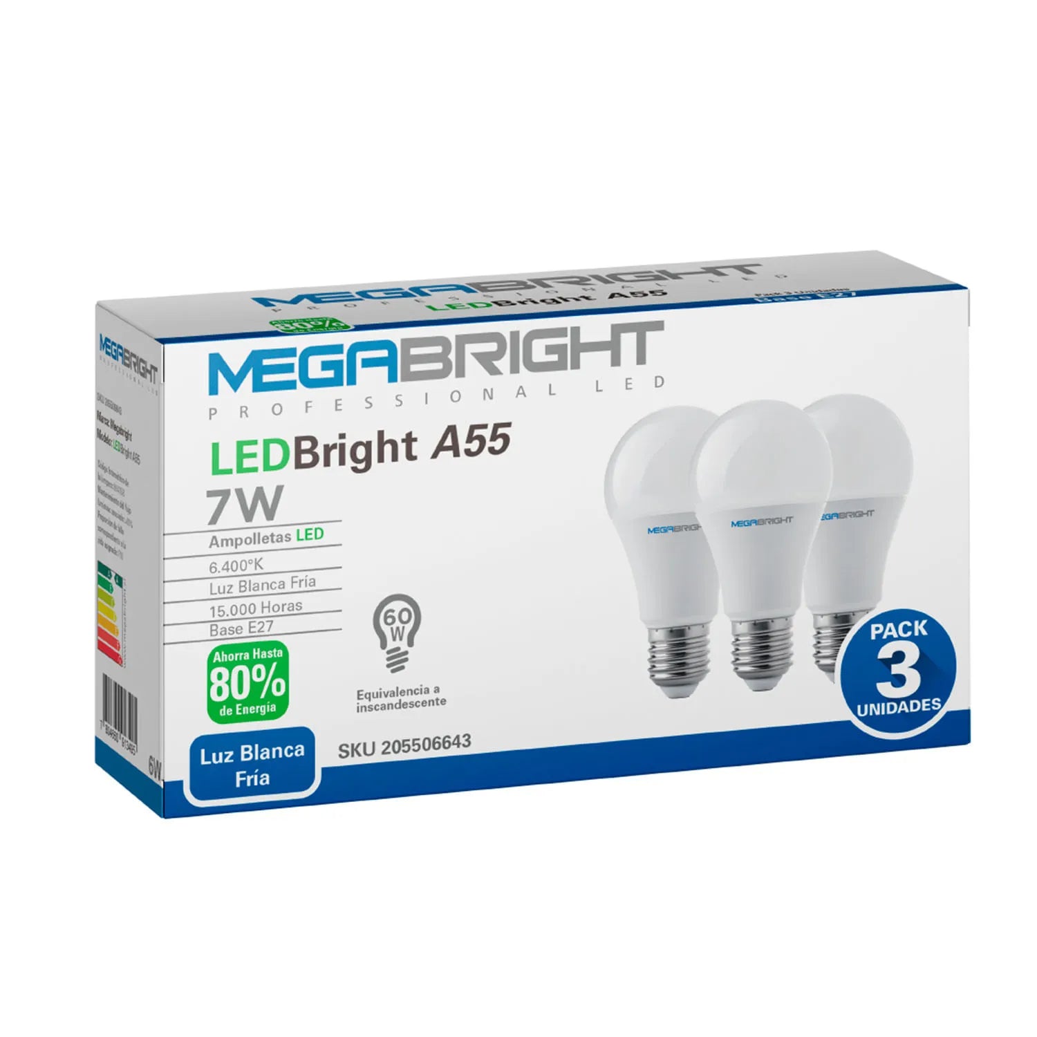 Ampolletas LED Megabright de 7 watts con base E-27 y modelo A55 que proporcionan iluminación de luz fría eficiente y duradera. Este pack de 3 unidades ofrece un excelente rendimiento energético, reduciendo significativamente el consumo eléctrico en comparación con las ampolletas tradicionales, mientras mantiene una óptima calidad lumínica para sus espacios.